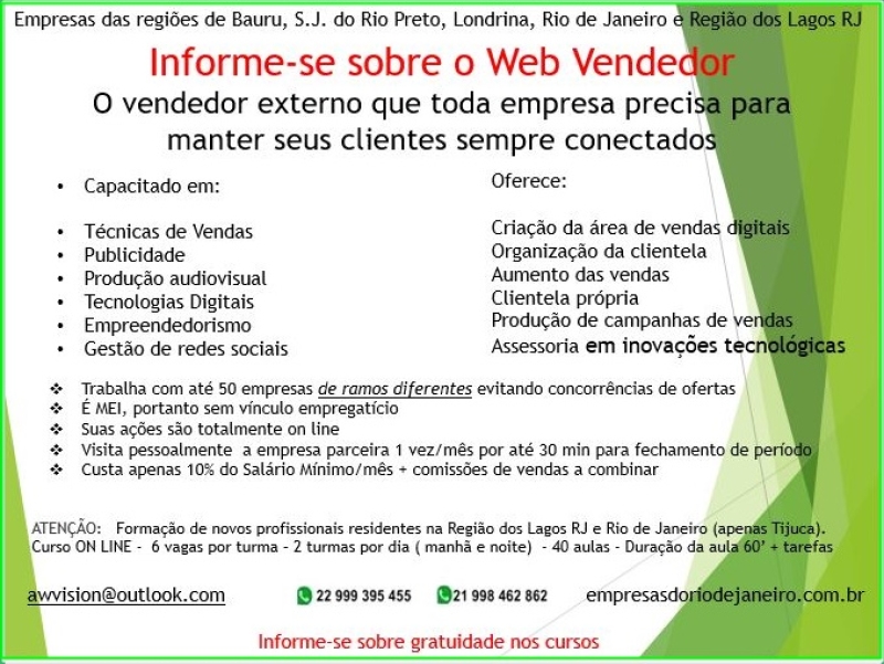 A parceria Itacom (Bauru SP) e AWVISION (RJ) está entregando para o mercado um meio de divulgação digital eficiente e sem custos. Qualquer empresa ou profissional liberal pode propagar seu negócio na internet facilmente e por quanto tempo quiser.